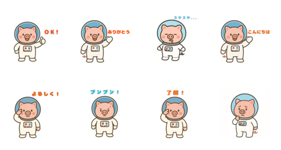 「OK」「こんにちは」「ありがとう」など、普段使いできる気持ちを宇宙服を着た子ブタさんで表現しました。(オリジナルキャラ:オグー豚使用)