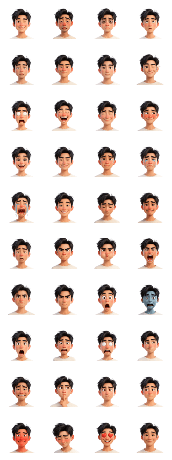 笑顔や照れ顔、怒り顔など、若い男性のリアルな表情が勢ぞろい。文字なしで気持ちを伝えられる、毎日使いやすい3Dアニメスタイルのスタンプです。