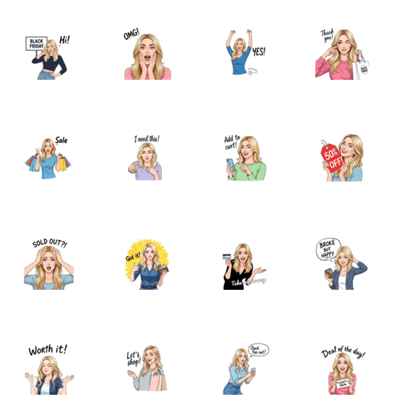 Get ready to shop! These LINE stickers capture young women's excitement for Black Friday deals. Share your shopping fun with vibrant stickers!