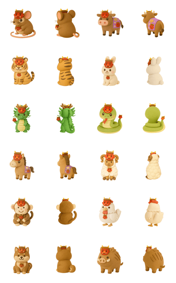 | スタンプ説明 | 紙粘土風の干支たちが鬼の姿で節分を楽しむ! 福を呼び、厄をはらうかわいい2月のスタンプです。 |