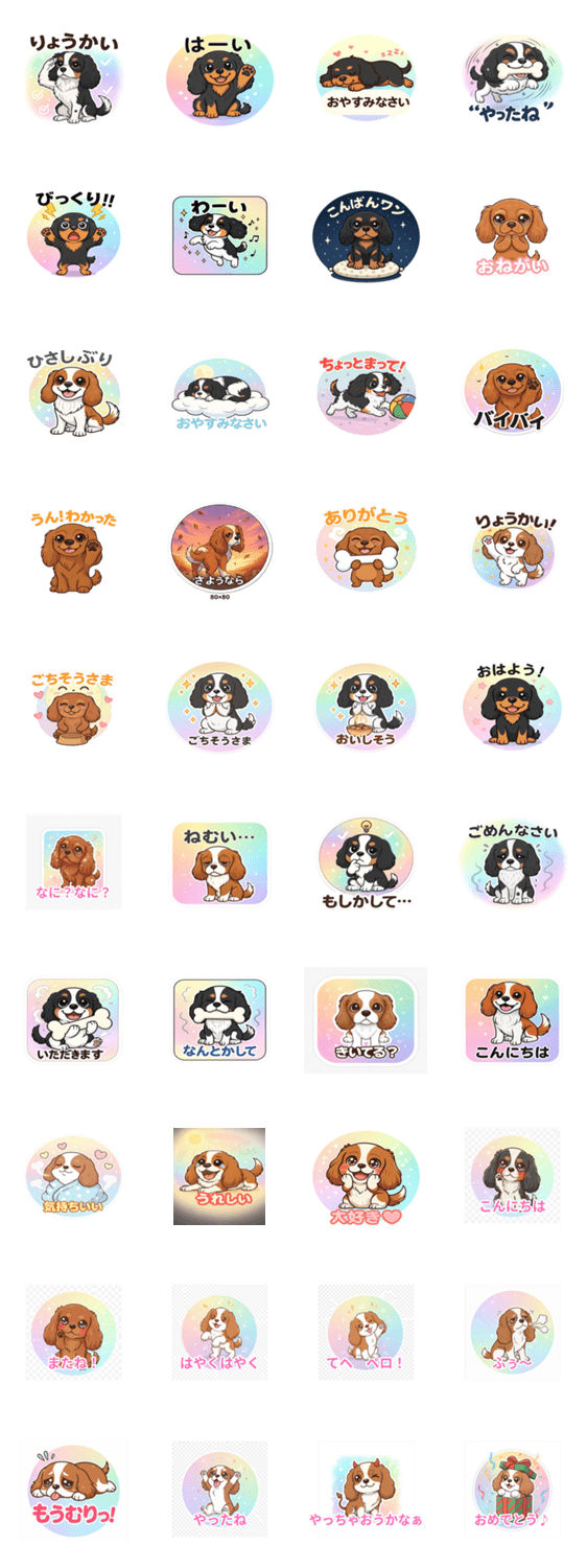 | スタンプ説明 | トライカラー・ブレンハイム・ルビー・ブラックタンのキャバリアが愛くるしい表情のキャバリア好きにはたまらないスタンプです。 |