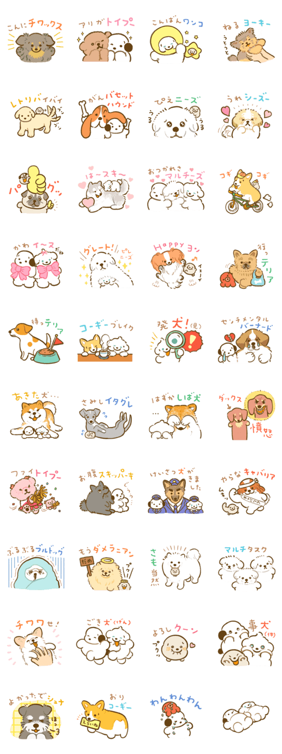 黒耳ココモとまふまふスモアはおだやかで健康な犬。いろんなわんこのダジャレを集めたスタンプ第二弾だよ♬