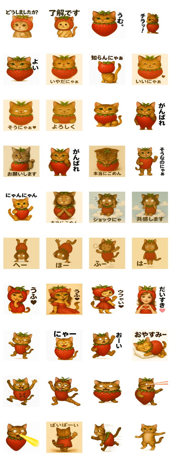 いちごと猫が合体した、かわいくてちょっとシュールな「いちご猫」スタンプ 癒し系で笑顔になれるLINEスタンプです