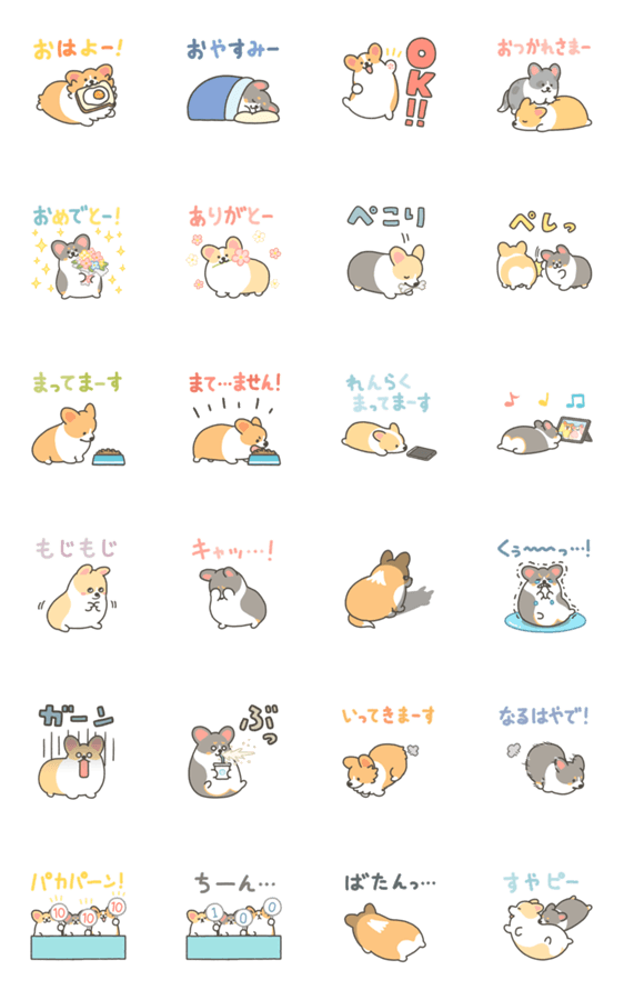 コーギー犬の動くスタンプです。今回は日常会話で使いやすいスタンプ多め。日々の生活にうごくコギの成分が欲しくなったらお使いください。