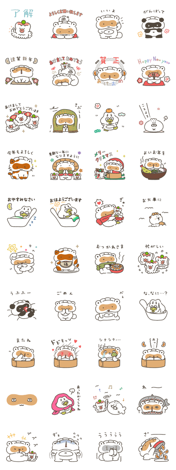 「あけおめスタンプ2025」特集に参加した餃子のたぬきと仲間たちの年末年始の挨拶に使えるスタンプです!※毎年使えるように一部修正、変更しました。