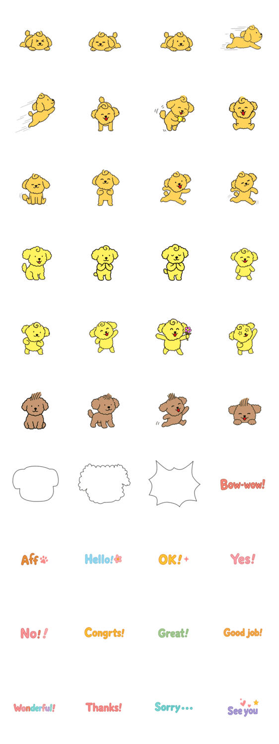 トイプードルのスライス(オレンジ)、スピン(黄色)、フラット(茶色)の3匹は仲良しです。トイプードルと吹き出しとメッセージを組み合わせられます。