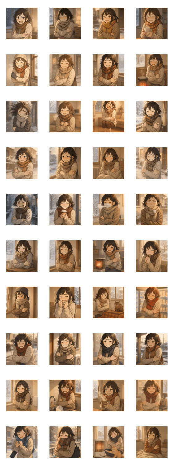 寒い朝や夜に寄り添う、あたたかい冬スタンプ。 手を温めたり、マフラーにうずまったり。 寒いけど、心はほっこりする癒しのシリーズです。