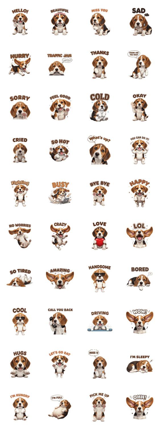 | スタンプ説明 | Let this Chic Beagle express your every mood with style! Featuring ultra-realistic fur and expressive poses. This adorable Beagle truly says it all!! |