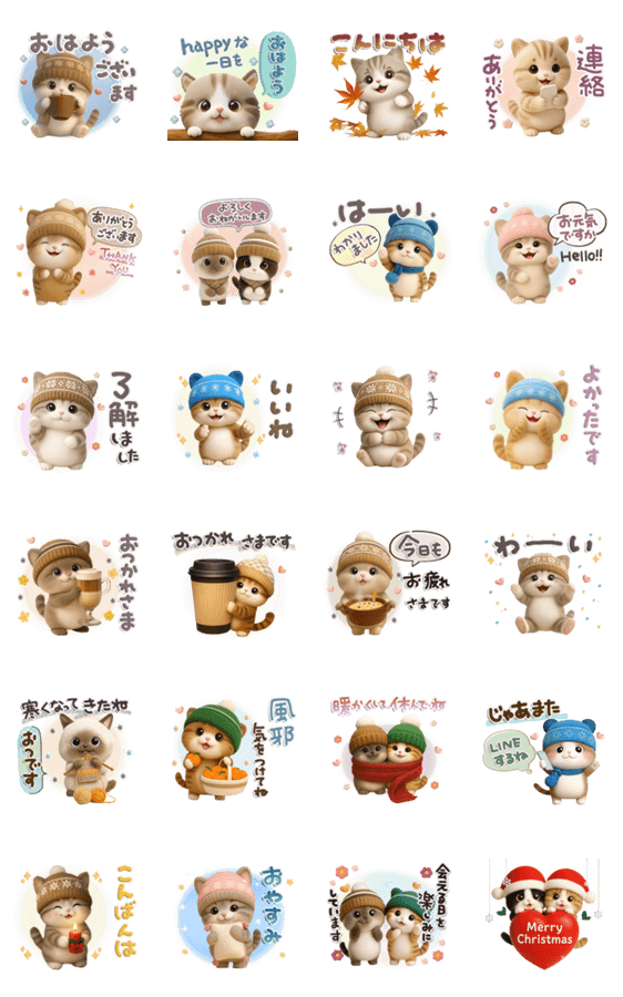 挨拶と気遣いちびニャンずのポップアップスタンプです。日常よく使う/毎日/家族/友達/連絡/日常会話/挨拶/敬語/思いやり/秋冬