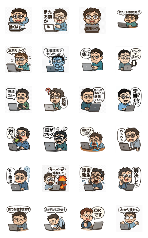 | スタンプ説明 | 「動くはずなのに…」「本番環境でやらかした」「帰りたい(切実)」などITエンジニアなら誰もが共感する切実な感情をコミカルに。言葉にできない心の叫びを届けましょう。 |