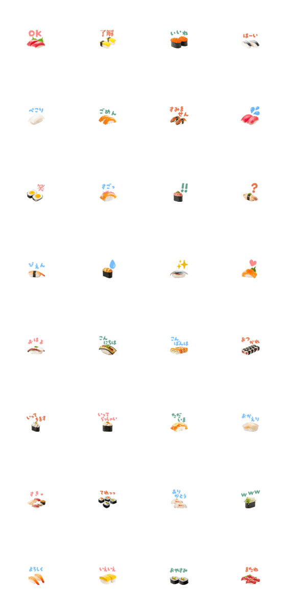 小さいミニサイズの可愛いスシの写真スタンプ。簡単で使いやすい。返事に便利。普段使える定番の挨拶や敬語。面白いゆるいおすし。老眼注意推し飯テロめし食べ物家族友達に