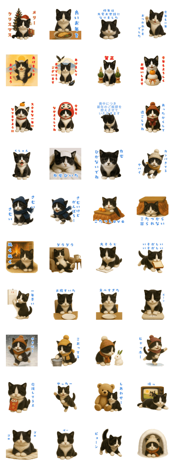 冬の日常にぴったり 人気のハチワレ猫シリーズから、ほっこり癒し系スタンプ登場 クリスマスやお正月の挨拶、寒い日のトークにも使えるあったかメッセージがいっぱい