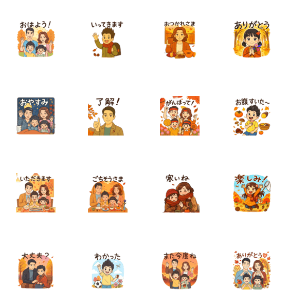 秋の温かさを家族で届けよう!紅葉、落ち葉、秋の味覚がいっぱいの16個のスタンプ。おはようからおやすみまで、日常会話で使える便利なフレーズを揃えました。