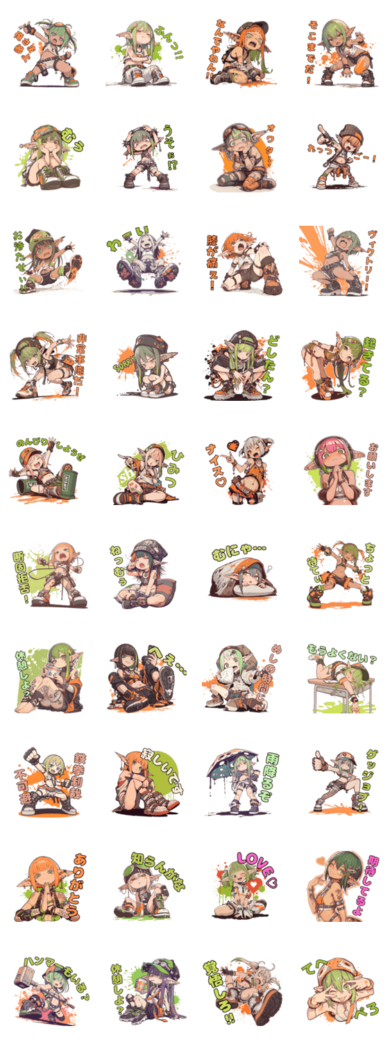 ストリート系のやんちゃなエルフが、全力で感情をぶつけるスタンプです。泣いて、叫んで、威嚇して、ふてくされる!気持ちをド派手に伝えたい時にどうぞ。