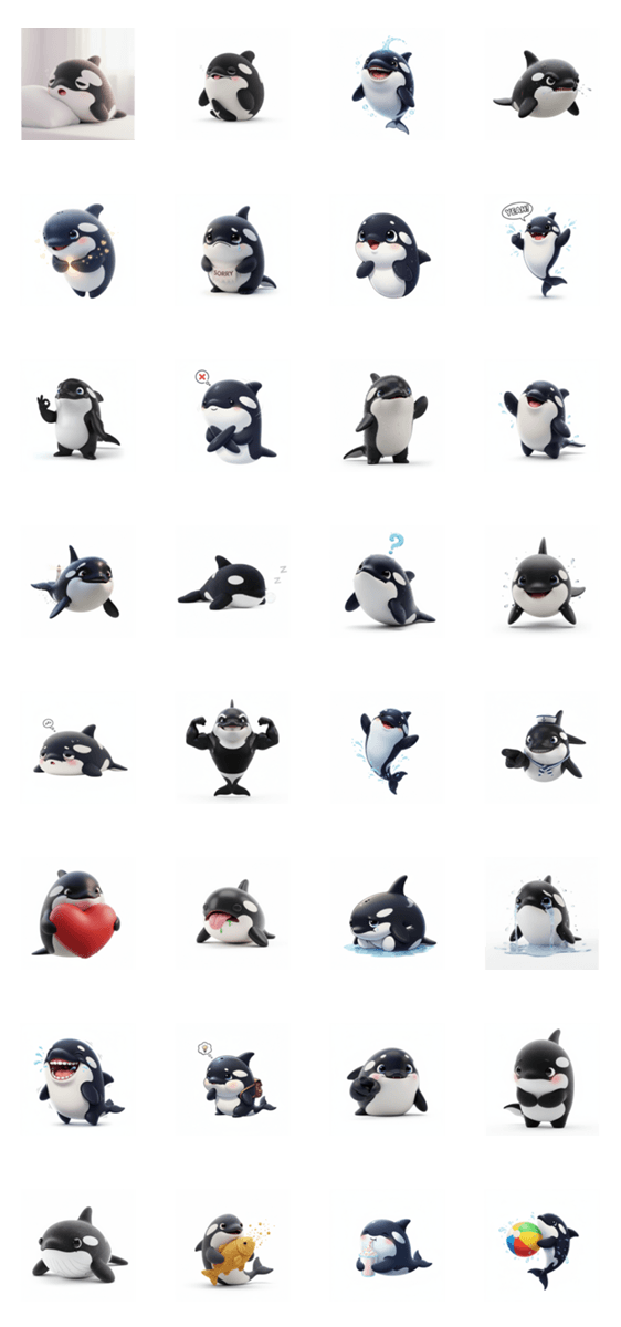 リアルな模様とつぶらな瞳が可愛いシャチの「オルカちゃん」スタンプ!子どもから大人まで、家族や友達との会話を楽しく盛り上げます。海の人気者でトークを飾ろう!