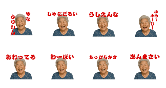 | スタンプ説明 | ニコニコしながら暴言を吐く。 沖縄方言で繰り出すおばぁの毒舌トーク。 ムカつく相手にも、友達への冗談にも使える万能スタンプ。 |