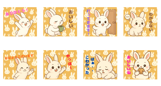 ふわふわ白うさぎが、毎日の気持ちをオーバーリアクションで可愛くお届け♪ あいさつからリアクションまで、使いやすい表情がたっぷり。