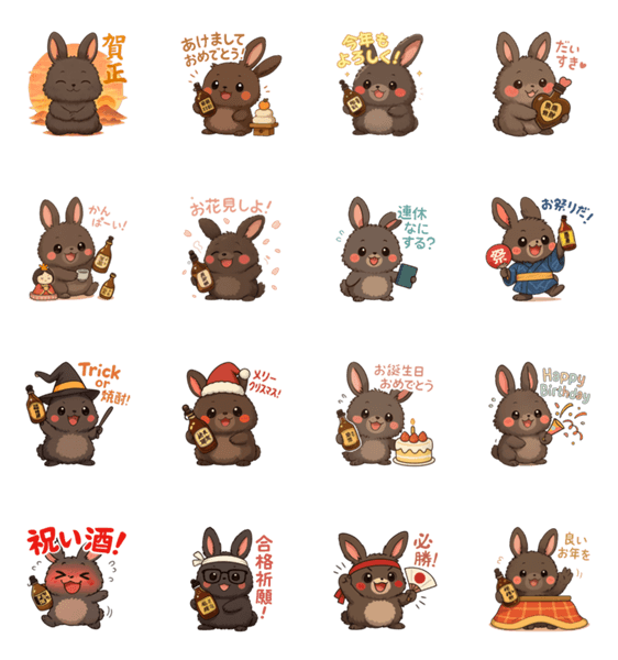 奄美大島のアマミノクロウサギが、黒糖焼酎片手にほろ酔い気分♪ 年中使えるあいさつやお誕生日メッセージも入った、使いやすいスタンプです!