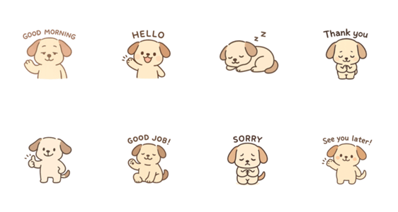 シンプルでゆるいタッチの犬のスタンプです。おはよう、ありがとう、お疲れ様など、毎日使える挨拶が揃っています。