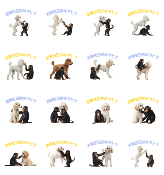 | スタンプ説明 | プードル チンパンジー ふわふわ モコモコ 仲良し 大型犬 人気の犬種 愛犬 犬 いぬ イヌ 戌年 忠犬 ほっこり おもしろい 癒し かわいい 使いやすい 日常 |