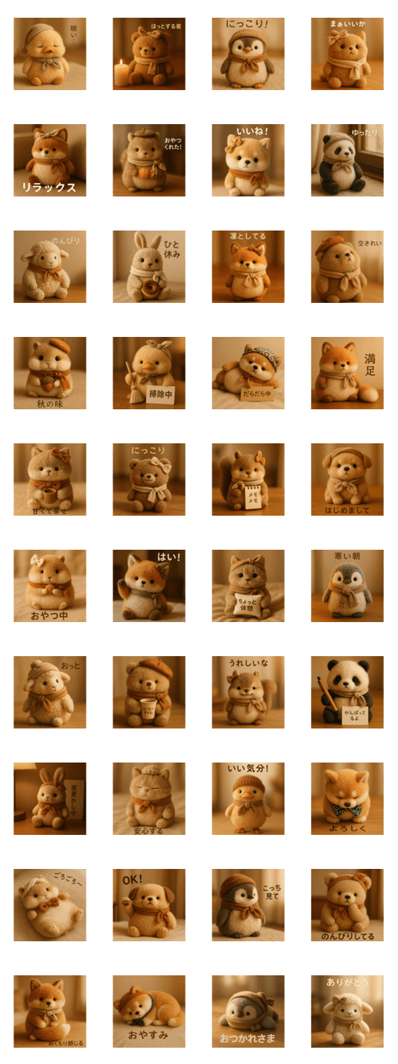 やさしい気持ちを届ける秋のぬいぐるみたち。 「ありがとう」「おつかれさま」「いいね!」など、毎日使える癒し系スタンプです。