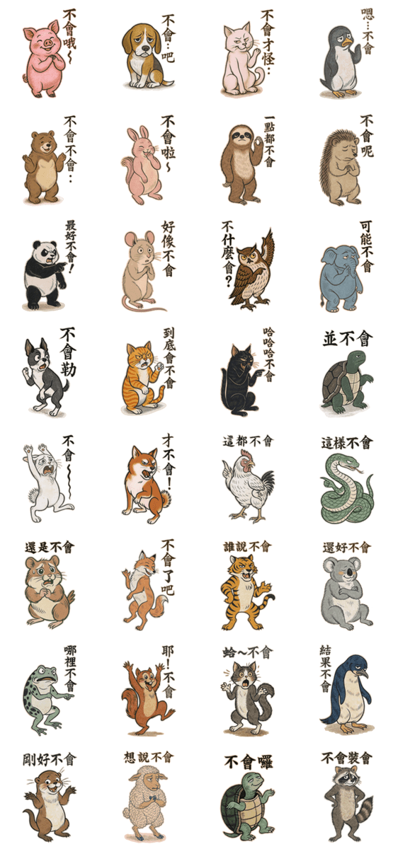 | スタンプ説明 | Will it or won't it? Will it or won't it? The monologues of the old-school animals. PART1 These stickers will show up extra large in chats. |