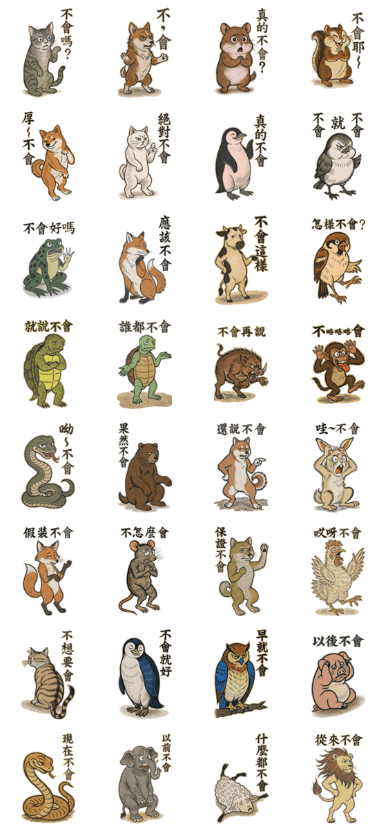 | スタンプ説明 | Will it or won't it? Will it or won't it? The monologues of the old-school animals. PART2 These stickers will show up extra large in chats. |