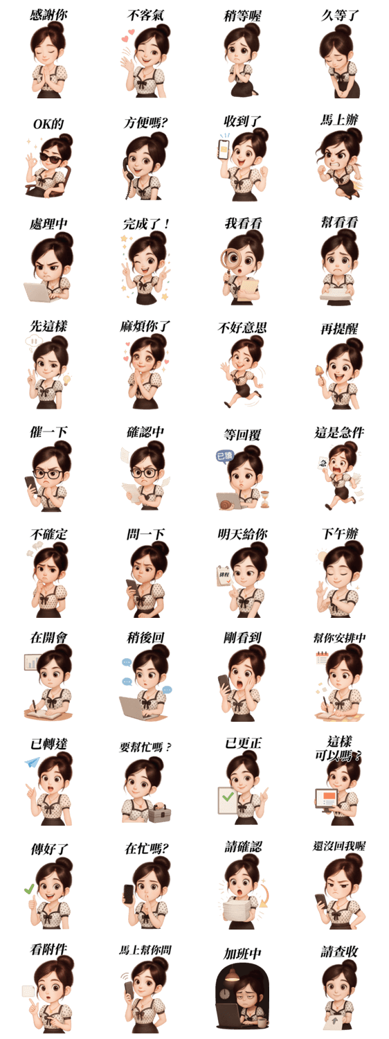 | スタンプ説明 | 「了解!」「返信中」「確認中」「残業中!」お団子お姉さんがいろんな表情であなたの職場ライフをかわいく応援! ※このスタンプはトークルームで大きく表示されるBIGスタンプです。 |