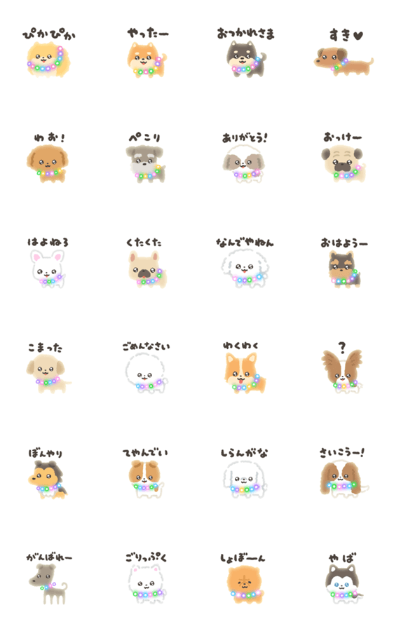 光る首輪をつけた犬のスタンプです ポメラニアン、柴犬、ダックスフント、トイプードル、ミニチュアシュナウザー、シーズー、パグ、チワワ、フレンチブルドッグ、他