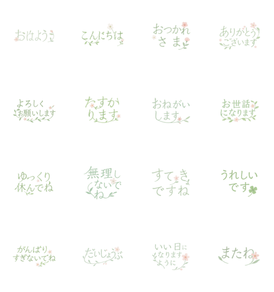 やさしい蔦と花で描いた、日常で使いやすいことばのスタンプ。 おつかれさま、ありがとう、またね。癒しとともに想いを届けます。