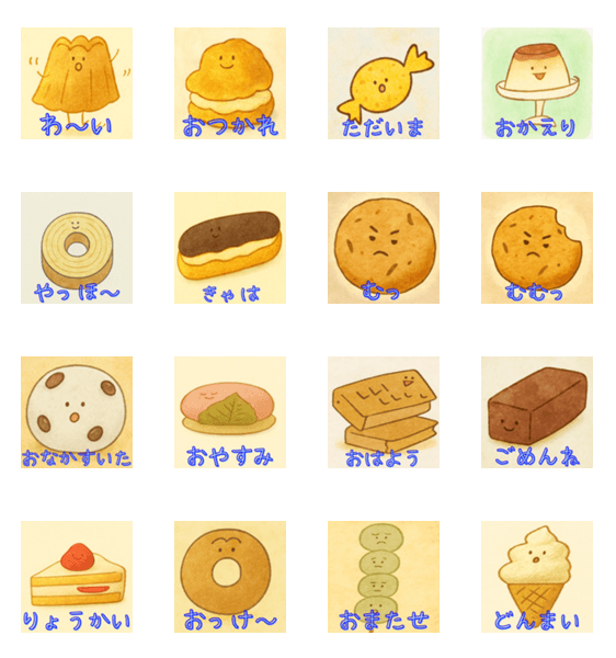 日常会話で使える、かわいいお菓子やデザート、スイーツのスタンプです。