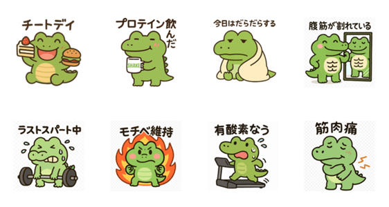 | スタンプ説明 | ゆるかわいいワニのキャラクターがダイエットや筋トレを頑張る仲間との会話を盛り上げます。「チートデイ」「プロテイン飲んだ」「腹筋割れた」など共感メッセージ満載! |