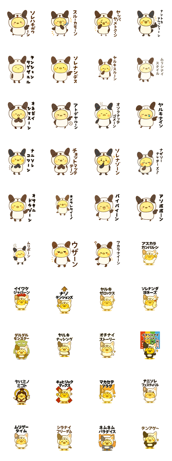 フレンチブルドッグの着ぐるみを着たヒヨコのピヨブルが、カタカナでしょーもないこと言ってます。