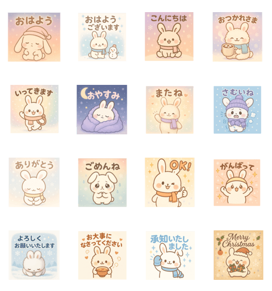 ゆるふわで可愛いうさぎの冬バージョンスタンプです。日常会話で使える挨拶や感情表現がいっぱい。寒い冬を温かく彩ります。