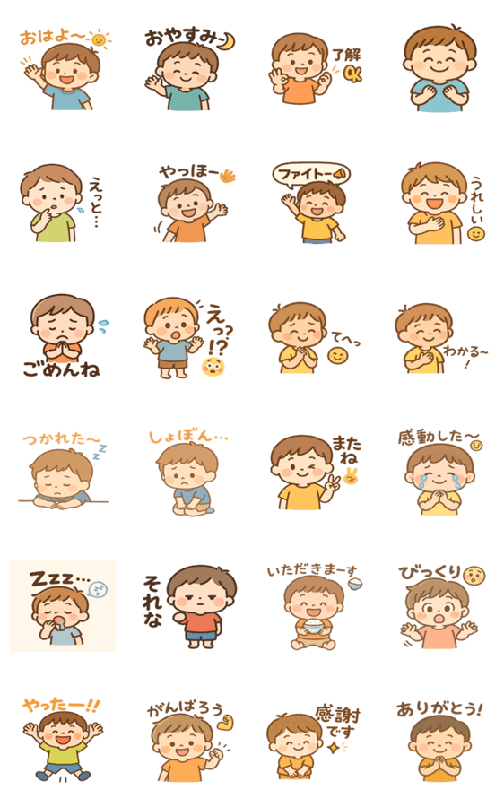 やさしい笑顔が癒やされる、ゆるっと可愛い男の子スタンプ☀️ 毎日のあいさつやリアクションにぴったり!