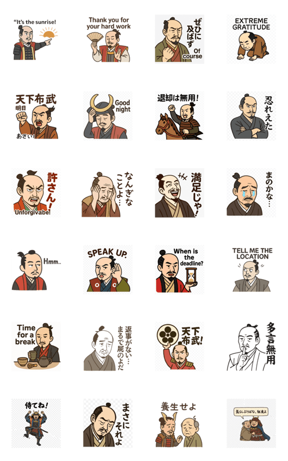 | スタンプ説明 | Oda Nobunaga, the great warlord, conquer your daily conversations! This set features 40 stamps with everyday phrases, perfect for middle-aged and older users. |