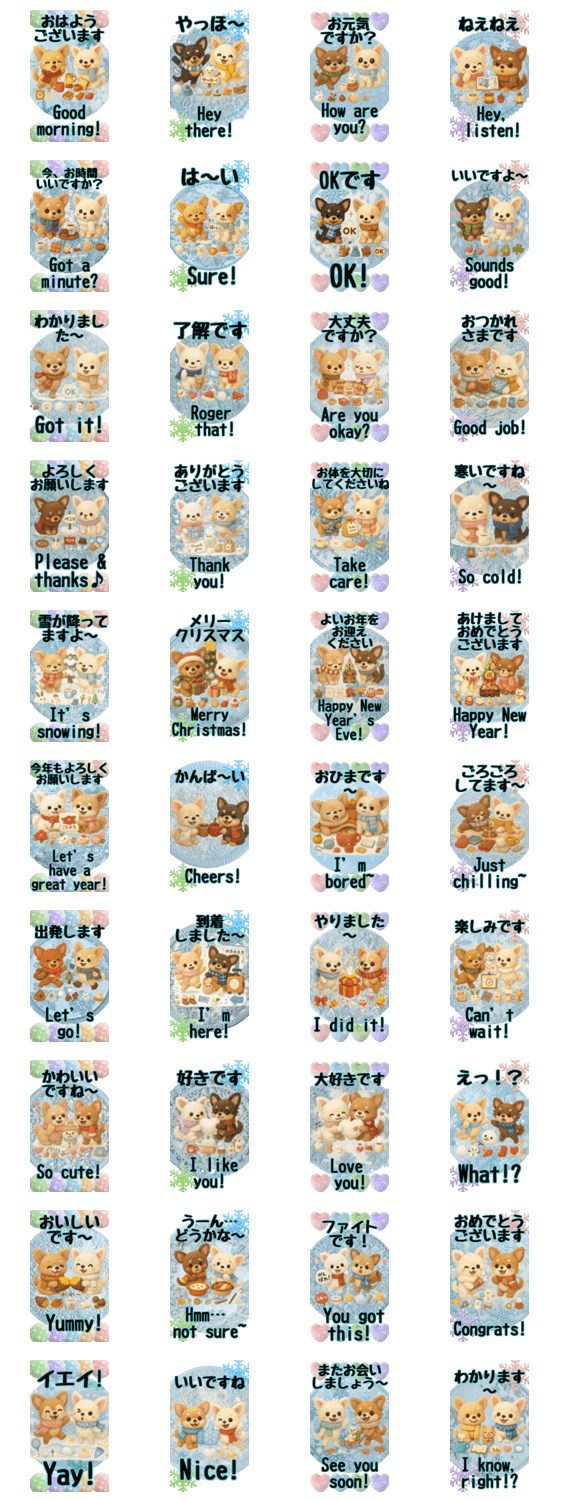 | スタンプ説明 | BIGサイズで登場!ふわふわチワワの冬スタンプ。「おはよう」「了解です」「あけましておめでとうございます」など、使いやすいフレーズをほっこり&癒しの表情でお届け。 ※このスタンプはトークルームで大きく表示されるBIGスタンプです。 |