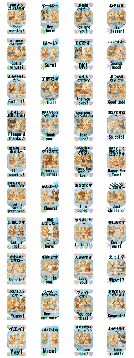 | スタンプ説明 | BIGサイズで登場!ふわふわコーギーの冬スタンプ。「おはよう」「了解です」「あけましておめでとうございます」など、使いやすいフレーズをほっこり&癒しの表情でお届け ※このスタンプはトークルームで大きく表示されるBIGスタンプです。 |