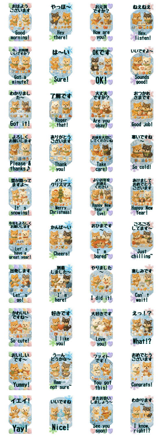 | スタンプ説明 | BIGサイズで登場!ふわふわ柴犬の冬スタンプ。「おはよう」「了解です」「あけましておめでとうございます」など、使いやすいフレーズをほっこり&癒しの表情でお届け。 ※このスタンプはトークルームで大きく表示されるBIGスタンプです。 |