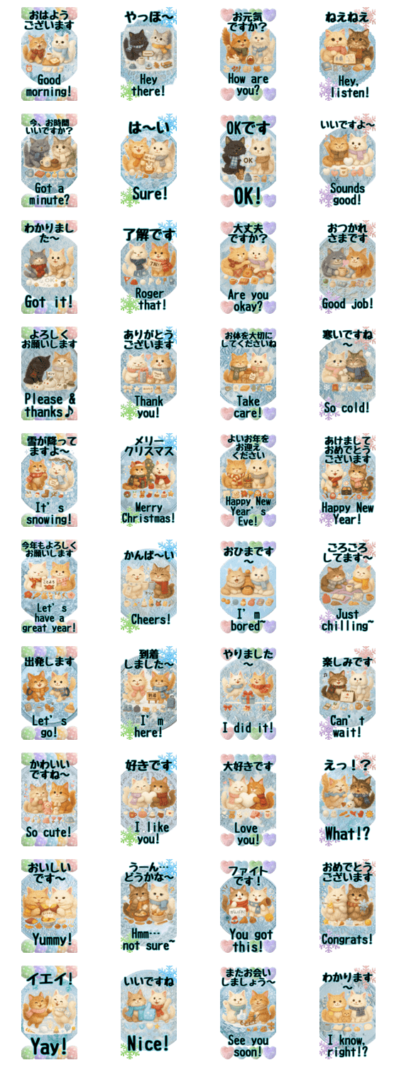| スタンプ説明 | BIGサイズで登場!ふわふわメインクーンの冬スタンプ。「おはよう」「了解です」「あけましておめでとうございます」など、心あたたまる表情でお届け。 ※このスタンプはトークルームで大きく表示されるBIGスタンプです。 |