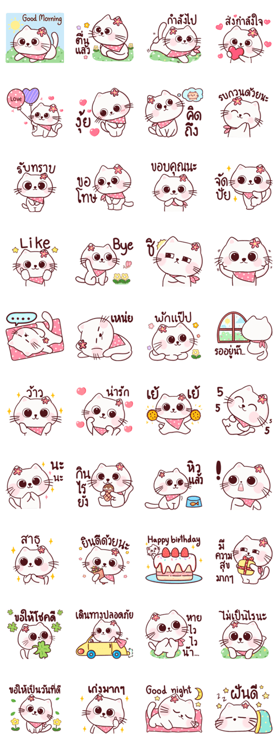 Mali, the sweet white kitty with a pink flower, is here to brighten your chats! Cute daily stickers for greetings, wishes, and happy moments.