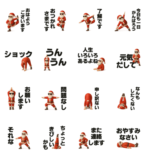 大きい文字で老眼でも見やすい!ヨガポーズのユニークなサンタクロース★クリスマスシーズンに楽しいトークを♥挨拶/おつかれ/がんばろう/また連絡します/おやすみ等