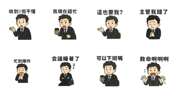 仕事に疲れたサラリーマンのためのスタンプセット。忙しすぎる日、会議中の寝落ち、上司からのプレッシャーなど、日常の気持ちをそのまま伝えます!