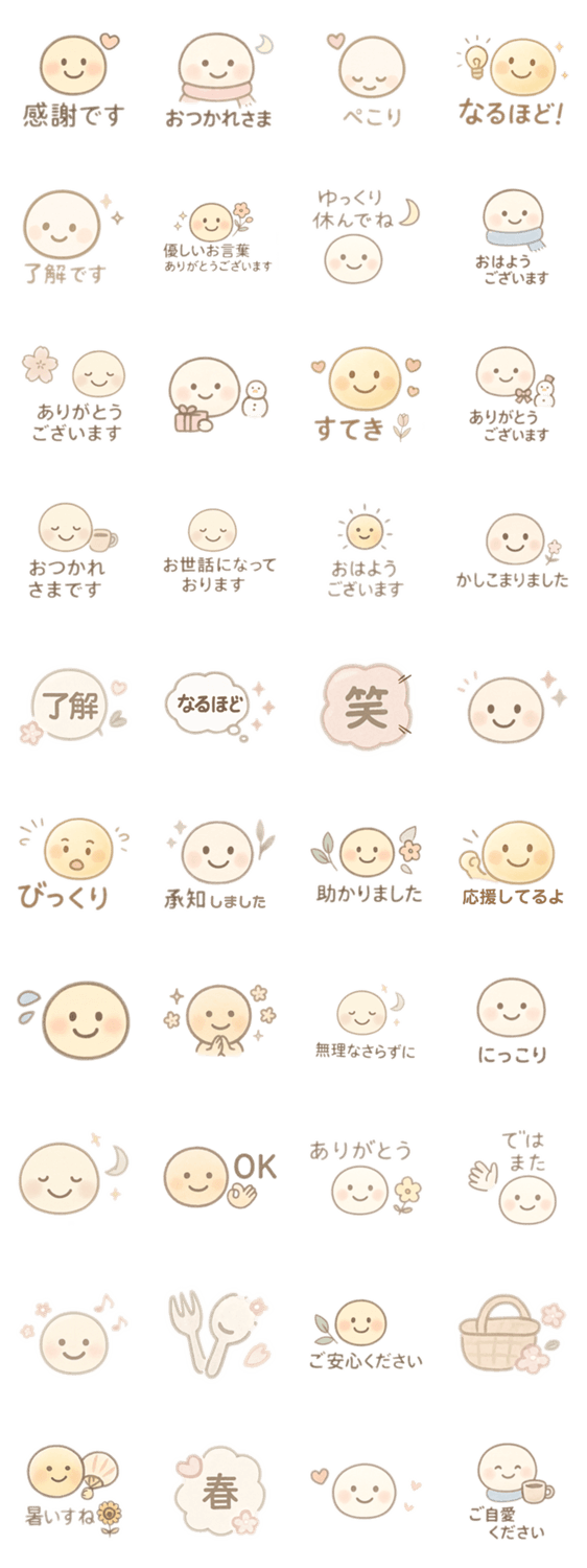 上品でやわらかい色合いの、日常に使いやすい気づかいスタンプです。 ビジネスにもママ友トークにもぴったり。癒しの笑顔で想いを届けます。