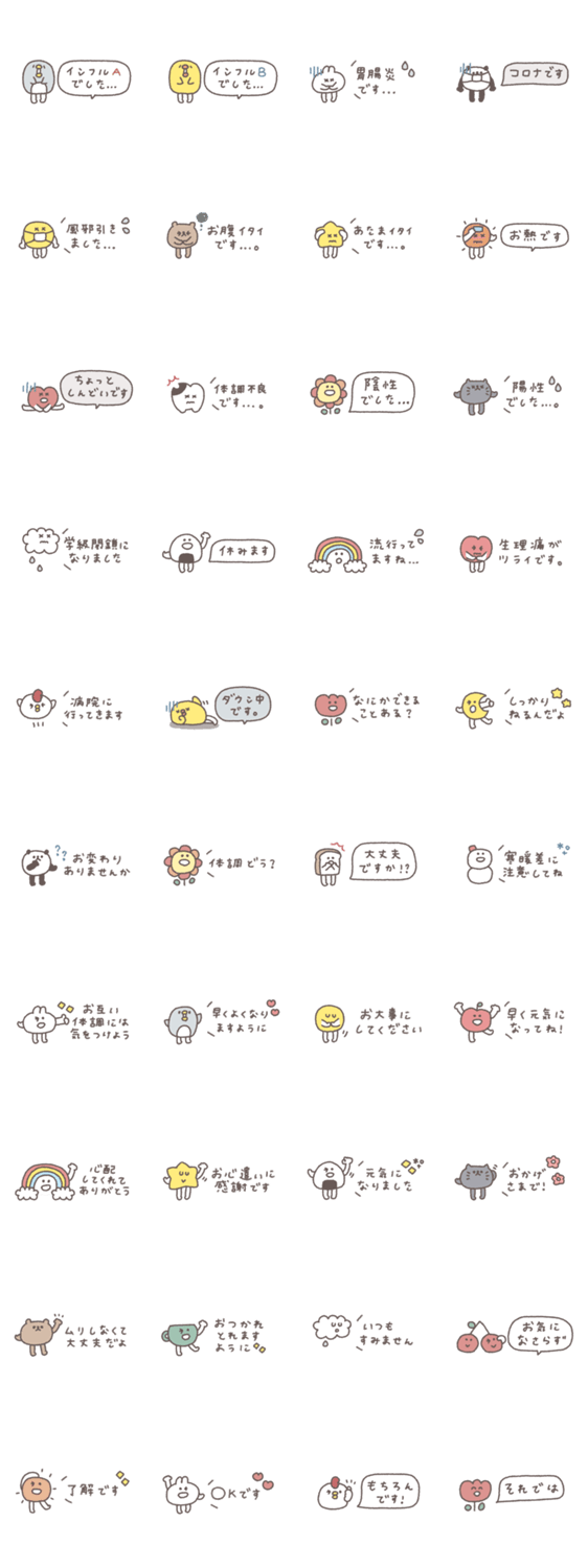 ゆるかわな生き物のあいさつスタンプです。 あいさつ/スマイル/手書き/くすみカラー/ペンギン/パンダ/トリ/うさぎ/くま/ねこ/歯/省スペース/風邪/病気