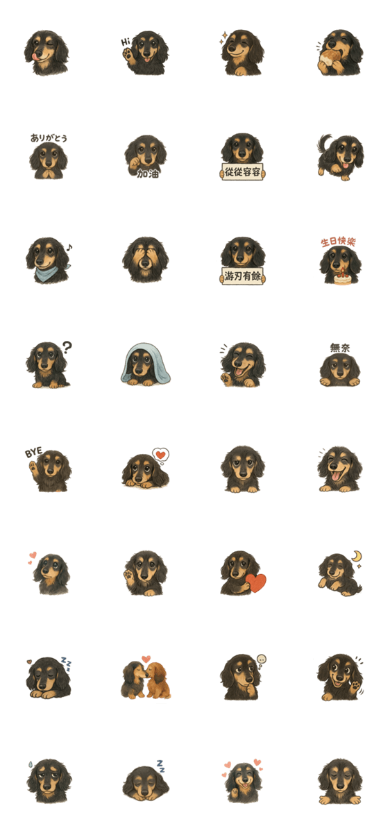 おはよう、がんばって、会いたい、そばにいるよ、ぎゅー、ちゅっ。ロングダックスの小さな愛を、やさしい手描きタッチでまとめた癒しのスタンプです。
