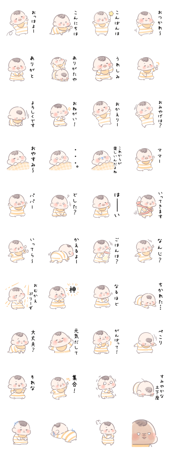 家族みんなで毎日使える、ゆるっと可愛い赤ちゃんスタンプ。 「ありがと」「ごはんは?」「おつかれ」など、家族LINEでよく使うワードを集めました。