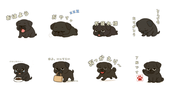 あなたの気持ちを伝えて、トークを笑顔と温かさで明るくする可愛い黒パグのスタンプです。