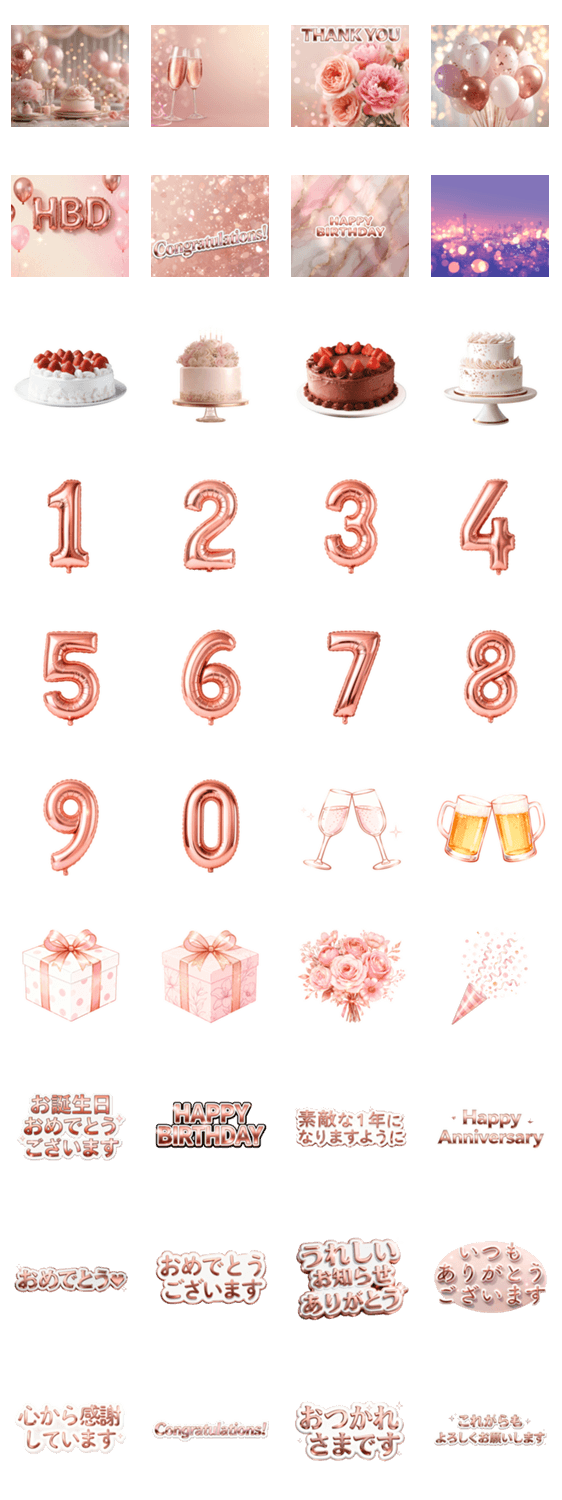 上品なピンクゴールドのお祝いスタンプ。背景や数字バルーン、ケーキや花束を自由にアレンジして誕生日や記念日、感謝に使えます。結婚祝/出産祝/合格/卒業入学/母の日に◎