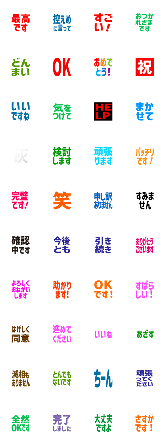 会話がスムーズになるミニ文字スタンプ40個。「控えめに言って」「最高です」「はげしく同意」など、会話が気軽に盛り上がる40種類。